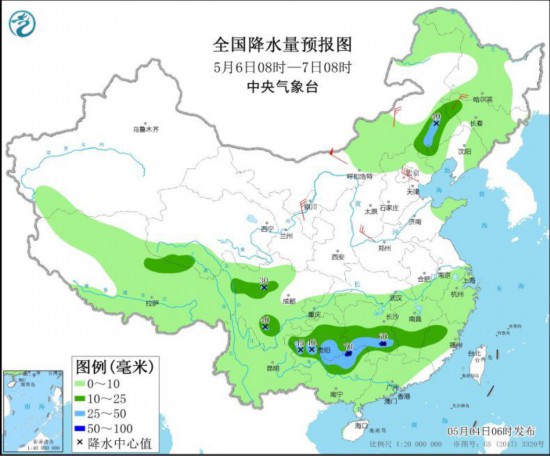 5月6日08时至7日08时,内蒙古东南部、吉林西部、四川南部、贵州大部、广西北部、江南南部等地的部分地区有中到大雨,其中,湖南南部、广西东北部等地局地有暴雨(50~70毫米)。内蒙古中东部、华北等地部分地区有4~6级风。