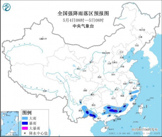 全国强降水落区预报图(5月4日08时-5日08时)