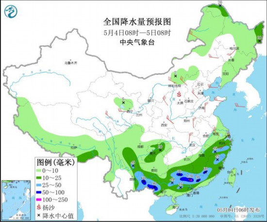 5月4日08时至5日08时,四川南部、云南东部、广西西部和东北部、广东中北部、湖南南部、江西南部和东北部、福建西南部和东北部、浙江中南部等地的部分地区有大到暴雨,其中广东北部等地局地有大暴雨(100~120毫米)。我国长江及其以北地区大部地区有5~7级风。
