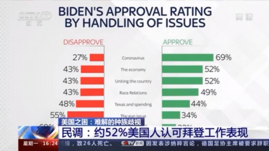 当地时间4月28日,美国总统拜登在国会山发表就职百日演说。据美国有线电视新闻网的民调统计,在拜登就任总统满100天之际,约52%的美国人认可拜登的整体工作表现,这一成绩仅好于其前任特朗普,但却低于自1953年的全部其他美国总统。