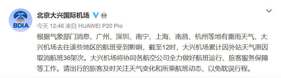大兴机场微博表示,根据气象部门消息,广州、深圳、南宁、上海、南昌、杭州等地有雷雨天气,大兴机场去往该些地区的航班受到影响,截至12时,大兴机场累计因外站天气原因取消航班36架次。大兴机场将协同各航空公司全力做好航班运行、旅客服务保障等工作。请出行的旅客及时关注天气变化和所乘航班动态,以免耽误行程。