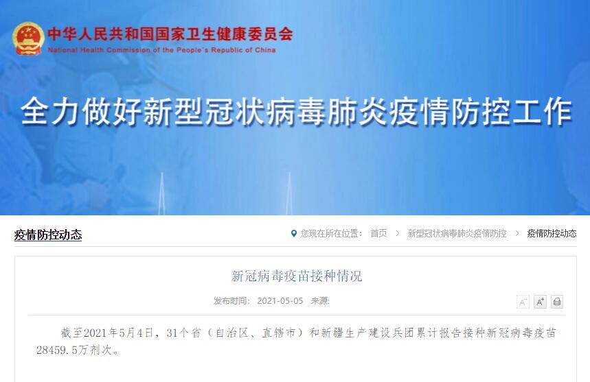 截至2021年5月4日,31个省(自治区、直辖市)和新疆生产建设兵团累计报告接种新冠病毒疫苗28459.5万剂次。