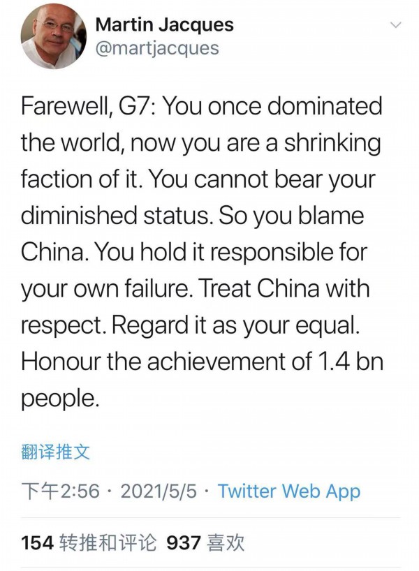为期两天的七国峰会外长会于当地时间5月5日在伦敦闭幕。英国学者马丁·雅克近日在社交媒体上就此连续发帖抨击七国集团。