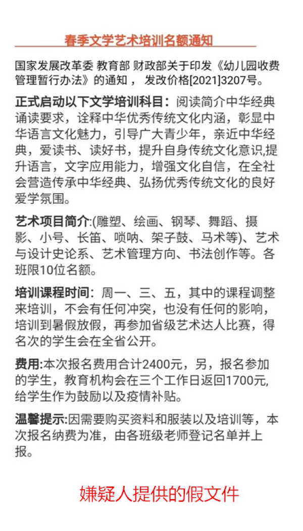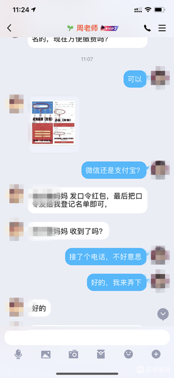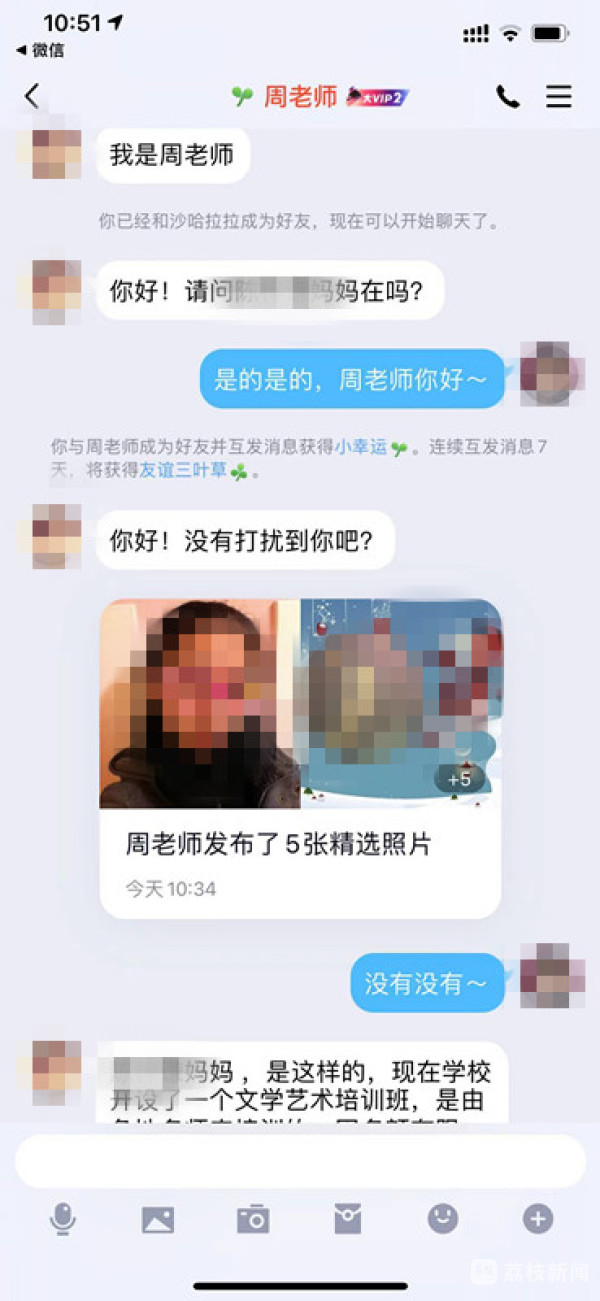 赵先生说,孩子班级有一个微信家长群,4月底的一天,群里的周老师加了爱人的微信私聊。因为是通过班级群加的微信,老师也一下子把孩子名字喊出来了,所以赵先生的爱人没有怀疑。老师称,学校最近在开展一项文化教育活动,给孩子们上艺术教育课,名额不多,需要抢报。