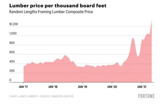 根据最新数据,4日美国每千板英尺木材的价格飙升至1359美元,也就是每立方米木材的价格升至约合3730元人民币的历史新高。自去年疫情暴发以来,美国木材价格已飙升了280%。