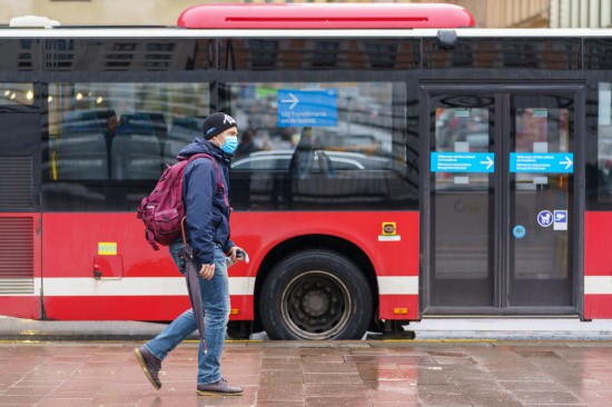 5月6日,在瑞典斯德哥尔摩,一名戴口罩的男子从公交车前走过。新华社 图