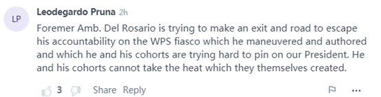 该网站上,有网友回击德尔罗萨里奥称,“他是在为自己在南海制造的惨败逃避责任,并且他和他的团队想归罪于我们的总统。他和他的团队承受不了自己造成的压力和批评”。