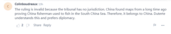 有网友表示,“(南海仲裁案)裁决是无效的,因为法庭没有司法权。中国很久以前的地图显示中国渔民过去常常在南海捕鱼。因此,它属于中国。杜特尔特理解这些并更希望(通过)外交(解决)”。