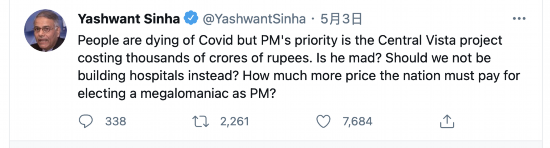CNN提到,在印度第二波疫情暴发之前,这一项目就已经引起争议,当时有人批评其将会以历史和(文化)遗产作为代价。但是最近随着印度疫情告急,反对声音也愈演愈烈,有政客抨击其为“虚荣项目”。前财政和外交部长亚什万特·辛哈在推特上说,“人们正在死于新冠病毒,但(莫迪总理)的首要任务是议会翻修项目。他疯了吗?我们不应该建造医院吗?”