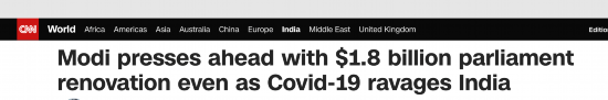 【环球网报道 记者 边子豪】“莫迪推动18亿美元的议会翻修项目,即使新冠疫情正在肆虐印度”。美国有线电视新闻网(CNN)7日以此为题报道称,在新冠疫情急转直下、氧气等物资短缺之际,印度总理莫迪还在推进一项18亿美元的议会大楼翻修项目,该项目甚至还包括了给总理修“新家”。莫迪此举引发民众和反对派人士不满。