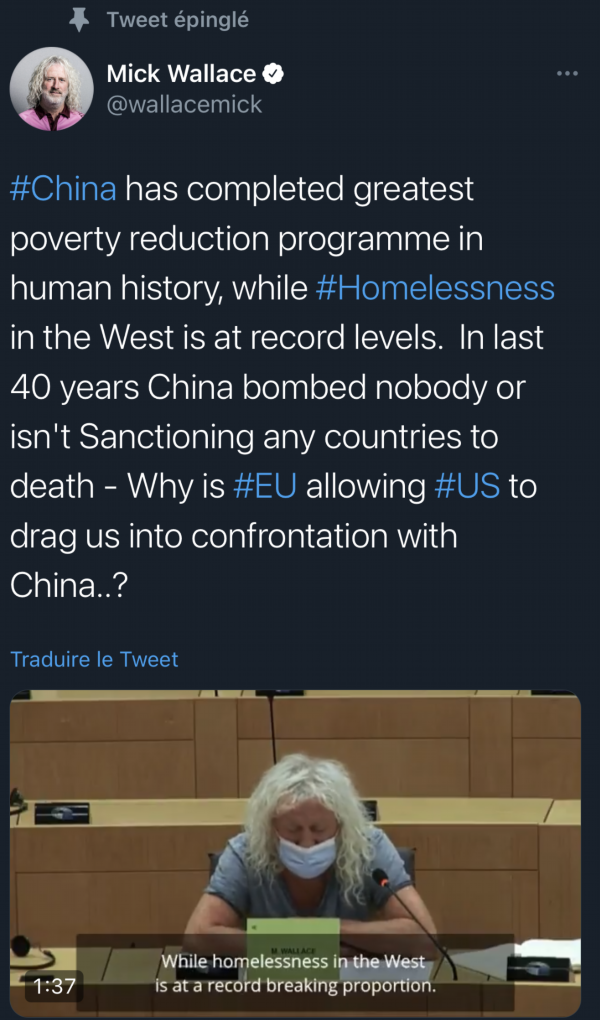 当地时间5月5日,欧洲议会议员华莱士(Mick Wallace)在其官方社交账号上发布了一段自己在议会上的发言视频。华莱士表示,中国刚刚完成了人类历史上最伟大的减贫计划,而反观西方国家,无家可归者人数创造了新的纪录。