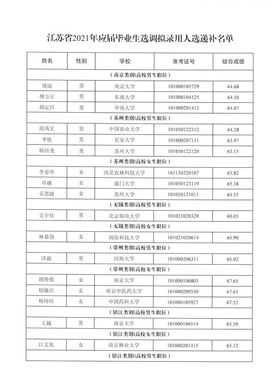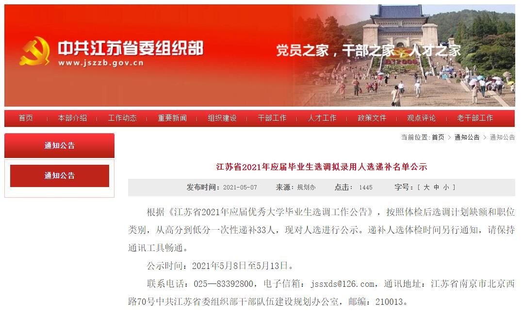 我苏网讯 5月7日,中共江苏省委组织部官网公示省2021年应届毕业生选调拟录用人选递补名单。根据《江苏省2021年应届优秀大学毕业生选调工作公告》,按照体检后选调计划缺额和职位类别,从高分到低分一次性递补33人。公示时间:2021年5月8日至5月13日。