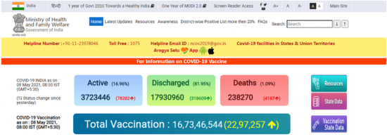 据印度卫生部5月8日最新数据,过去24小时内,印度新增新冠确诊病例401078例,累计确诊病例21892676例;印度新增死亡病例4187例,累计死亡238270例。