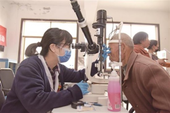 志愿者为中老年人免费进行眼科疾病检查。