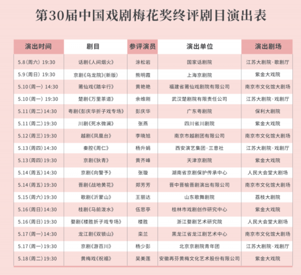 第30届中国戏剧梅花奖竞演将于5月8日至22日在江苏南京举行。