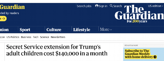 卸任总统后,特朗普的子女还在花纳税人的钱?据英国《卫报》报道,在特朗普今年1月卸任美国总统离开白宫后的一个月中,特朗普的4名成年子女的安保费用花掉了足足14万美元,并且用的还是美国纳税人的钱。