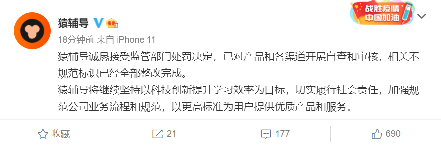猿辅导在官方微博表示,猿辅导诚恳接受监管部门处罚决定,已对产品和各渠道开展自查和审核,相关不规范标识已经全部整改完成。