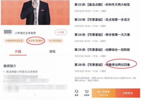 还有的在线教育平台喜欢给老师打上各种标签吸孩子家长。记者观察,在高途课堂APP,有位小学语文老师的介绍是“语文界‘郭德纲’”。其作文授课大纲中,其中一节显示为“详略得当两仪四象”。小学作文还要学“两仪四象”?