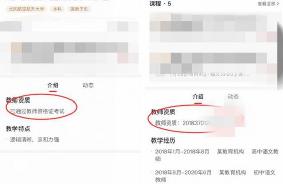 在学而思网校APP等多家在线教育APP上,记者注意到,很多名师只显示教师资格编号,还有的只显示“已通过教师资格证考试”,甚至有的老师介绍中,没有显示是否获得教师资格。
