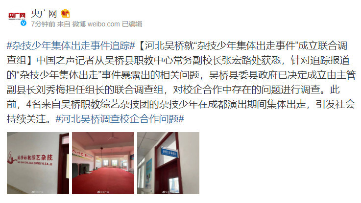 记者从吴桥县职教中心常务副校长张宏路处获悉,针对追踪报道的“杂技少年集体出走”事件暴露出的相关问题,吴桥县委县政府已决定成立由主管副县长刘秀梅担任组长的联合调查组,对校企合作中存在的问题进行调查。此前,4名来自吴桥职教综艺杂技团的杂技少年在成都演出期间集体出走,引发社会持续关注。