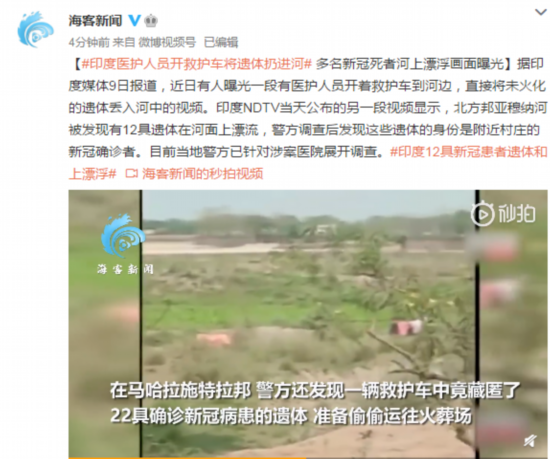 据印度媒体9日报道,近日有人曝光一段有医护人员开着救护车到河边,直接将未火化的遗体丢入河中的视频。印度NDTV当天公布的另一段视频显示,北方邦亚穆纳河被发现有12具遗体在河面上漂流,警方调查后发现这些遗体的身份是附近村庄的新冠确诊者。目前当地警方已针对涉案医院展开调查。