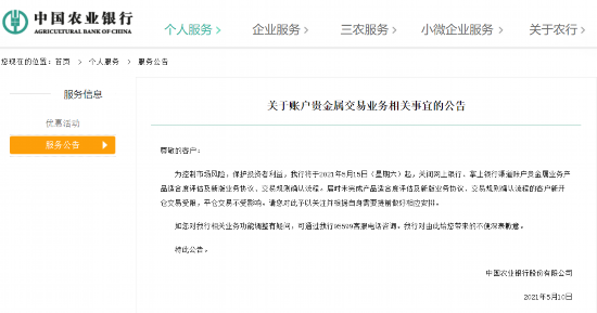 据中国农业银行网站最新公告,中国农业银行将于2021年5月15日(星期六)起,关闭网上银行、掌上银行渠道账户贵金属业务产品适合度评估及新版业务协议、交易规则确认流程。