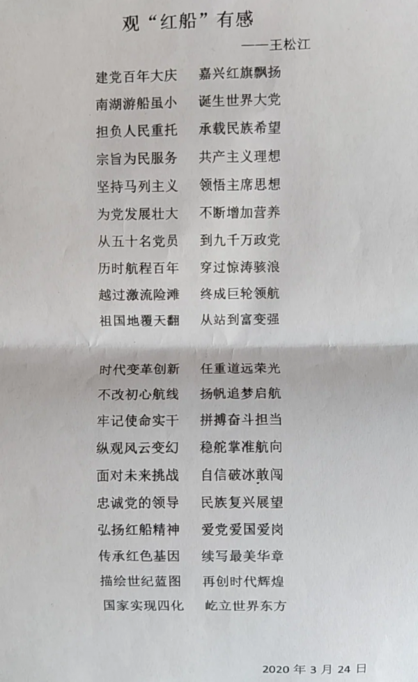 马瑞香的老伴儿王松江是位老党员,建党100周年来临之际,老两口专门去浙江嘉兴参观了中共“一大”会址——南湖红船,感受“红船精神”。回来后王松江还作了一首诗《观“红船”有感》: