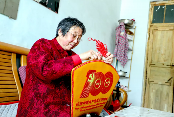 马瑞香则和老伴儿商量,由王松江设计出样,马瑞香制作,创作一系列建党100周年主体刺绣……