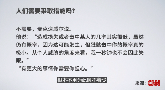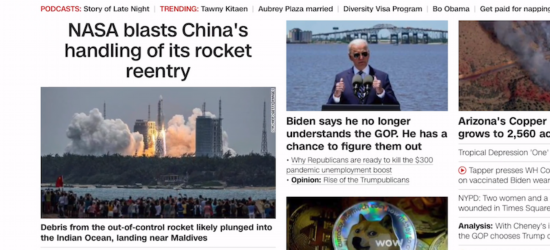 CNN在一篇文章里大谈特谈“失控太空残骸”进入地球,什么猜测长征火箭残骸中落点啊,拜登政府要怎么做,煞有介事。最后的落脚点是——专家说:人们不需要为此进行防备,因为出事几率太低,根本不用为此睡不着觉,“有更多事情需要你担心”。