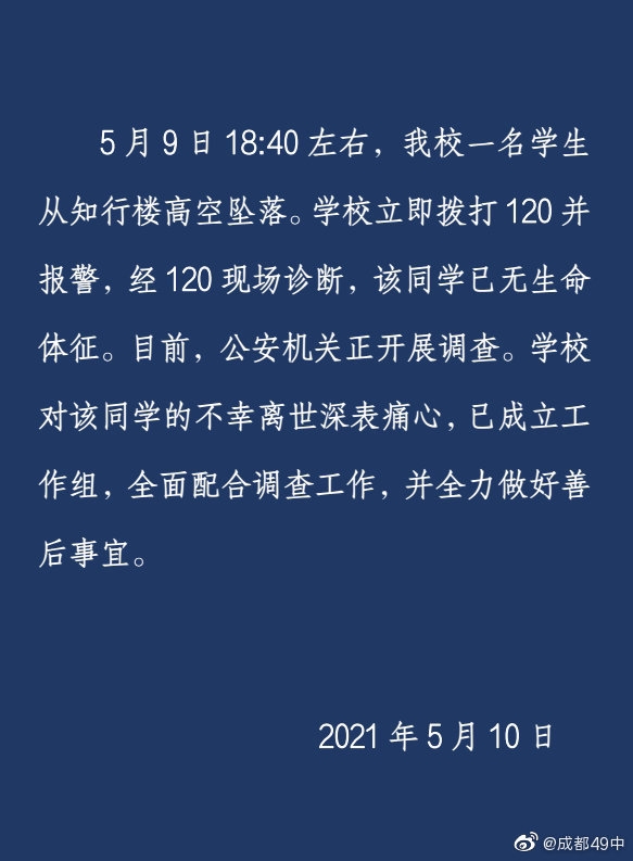 5月10日下午,成都第四十九中学校在其微博上发布官方回应称,5月9日18:40左右,该校一名学生从知行楼高空坠落。学校立即拨打120并报警,经120现场诊断,该同学已无生命体征。目前,公安机关正开展调查。学校对该同学的不幸离世深表痛心,已成立工作组,全面配合调查工作,并全力做好善后事宜。