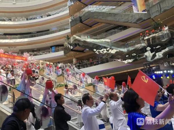 “唱支山歌给党听,我把党来比母亲,母亲只生了我的身,党的光辉照我心……”5月9日上午,徐州市鼓楼区苏宁广场响起了耳熟能详的歌声。随着音乐的响起,四面八方的人们不约而同地加入合唱队伍,一边挥舞着党旗,一边情不自禁地一起引吭高歌,他们中间有儿童、有少年、有中年、有老年,一百多人将歌声、小提琴声、唢呐声巧妙地融合在一起,场面震撼人心,激昂的旋律久久萦绕在人们耳畔。