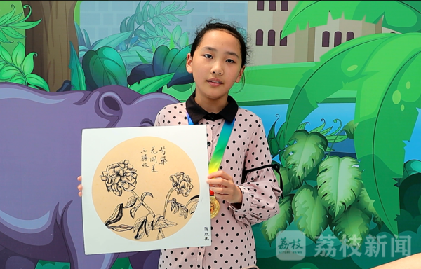 同场竞技的李庚文同学,画作动静结合,一片芍药花海中,还有一只蝴蝶落在枝头。她说:“我这幅画的主题是和谐和美好,希望我们的生活也是如此,越来越和谐。”
