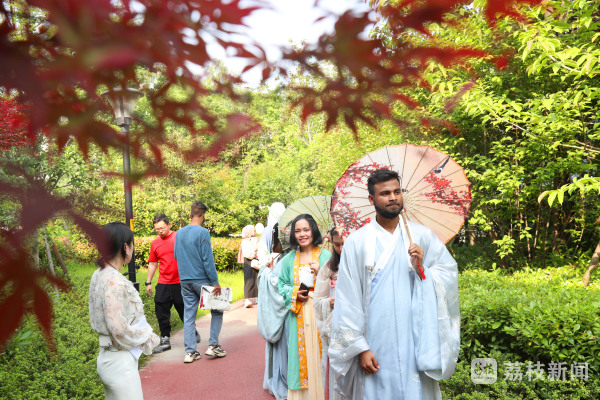 在悠扬的古琴声中,身着各色汉服的外国俊男靓女从小竹林缓缓而来,女生们手持亲手绘制的宫扇,或遮面障羞,或拂扫浮尘;男生们则秀出各种姿势,瞬间英气十足。“洋朋友”的这场汉服走秀圈粉全场,引来声声喝彩。