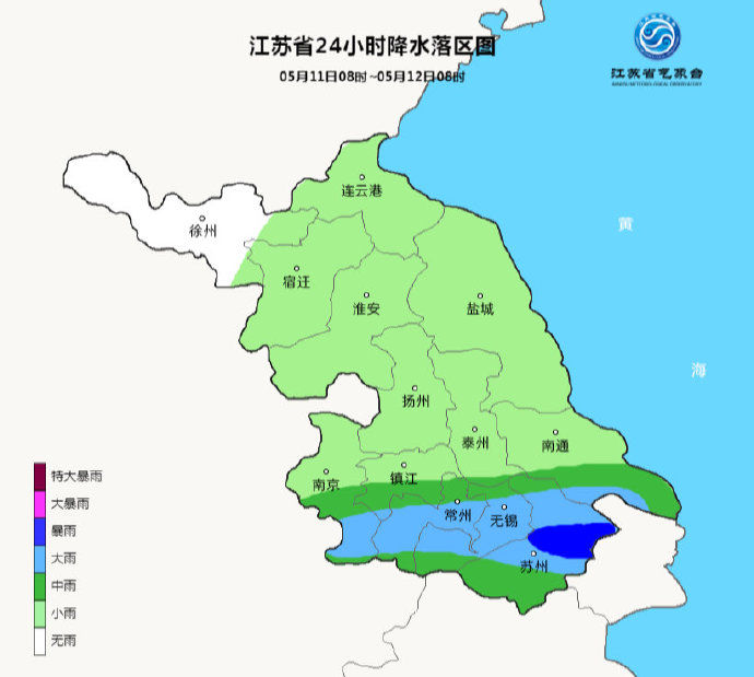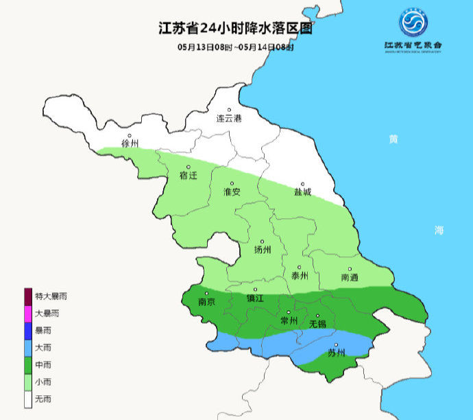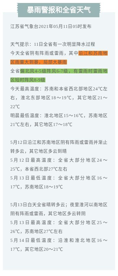 我苏网讯 据江苏省气象台消息,今天全省阴有阵雨或雷雨,其中沿江和苏南地区雨量大到暴,局部大暴雨,全省偏北风4-5级阵风6-7级,有雷雨时雷雨地区短时阵风8-9级,今天最高温度:苏南和本省西北部地区24℃左右,淮北东部地区18~19℃,其它地区21~22℃,明晨最低温度:淮北地区15~16℃,苏南地区21℃左右,其它地区17~18℃。