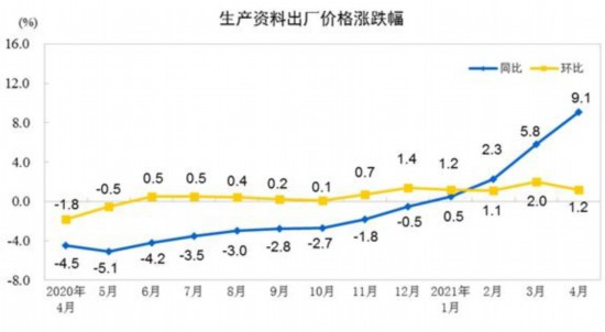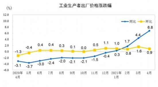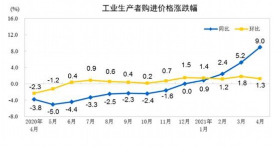 据国家统计局网站消息,2021年4月份,全国工业生产者出厂价格同比上涨6.8%,环比上涨0.9%;工业生产者购进价格同比上涨9.0%,环比上涨1.3%。1-4月平均,工业生产者出厂价格比去年同期上涨3.3%,工业生产者购进价格上涨4.3%。