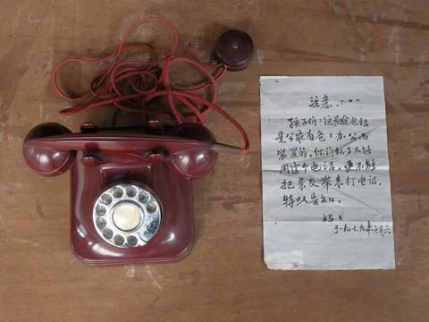 刘伯承使用的旧式电话机、汪荣华同志在电话旁贴上的亲笔向子女写的告示(图片来源:刘伯承同志纪念馆网站)