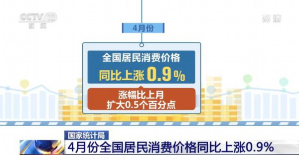 先看居民消费价格,4月份,全国居民消费价格同比上涨0.9%。涨幅比上月扩大0.5个百分点。其中,食品价格下降0.7%,非食品价格上涨1.3%。1到4月平均,全国居民消费价格比去年同期上涨0.2%。