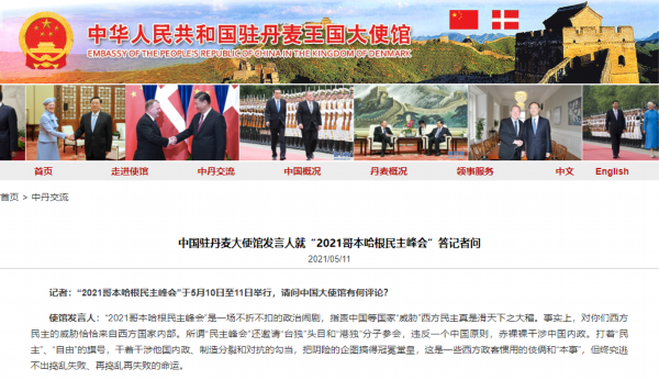 中国驻丹麦大使馆官方网站消息:有记者提问,“2021哥本哈根民主峰会”于5月10日至11日举行,请问中国大使馆有何评论?