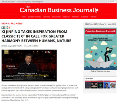 CGTN官网发布英语特稿《经典中的智慧:中国走向低碳未来的绿色道路》,在解读典故的同时,介绍了中国政府在绿色发展领域所采取的积极举措以及一系列成就。目前官网相关报道已经获得了来自美国、英国、加拿大、意大利、澳大利亚、印度、墨西哥、古巴、秘鲁、西班牙、阿根廷等国家和地区的819家海外主流网络媒体转载。代表转载媒体有美联社、雅虎财经、市场观察、晨星网、意大利克罗诺斯通讯社、国际金融时报、澳联社、印度今日商业、印度新德里时报、古巴经济学家报等,累计触达海外受众达5.2亿人次。