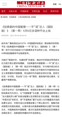 中央广播电视总台CGTN(中国国际电视台)策划制作的《经典里的中国智慧——平“语”近人(国际版)》(第一季)第一集《取之有度 用之有节》通过“中西对话”的形式,由海外受众的角度,从习近平主席讲话引用的经典中阐释中国文化、中国智慧以及中国政府在治国理政中的实践。