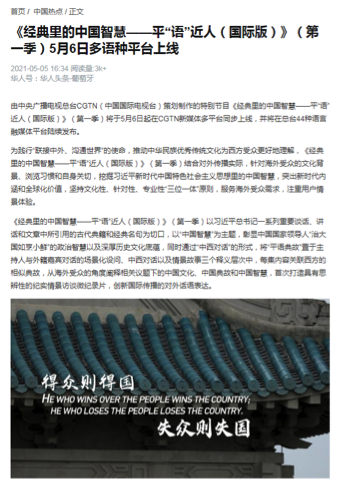 第一集节目仅在CGTN英语主账号就获得全球阅读量1577万,独立用户访问量1277万,视频观看量251万,互动量4.5万。微博平台“#经典里的中国智慧#”话题阅读量7749.2万。