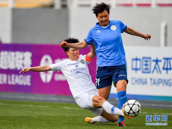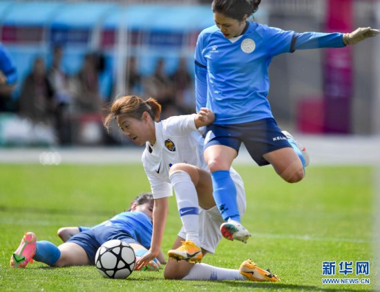 5月11日,上海农商银行队球员刘洁茹(左)与江苏女足球员严晓玉在比赛中拼抢。