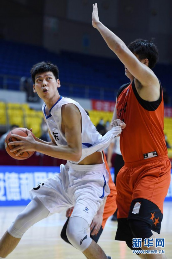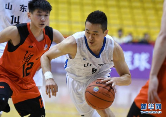5月11日,山东队球员许家晗(中)在比赛中持球进攻。