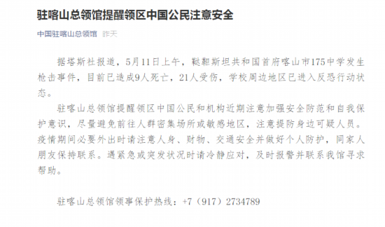驻喀山总领馆提醒领区中国公民和机构近期注意加强安全防范和自我保护意识,尽量避免前往人群密集场所或敏感地区,注意提防身边可疑人员。疫情期间必要外出时请注意人身、财物、交通安全并做好个人防护,同家人朋友保持联系。遇紧急或突发状况时请冷静应对,及时报警并联系我馆寻求帮助。