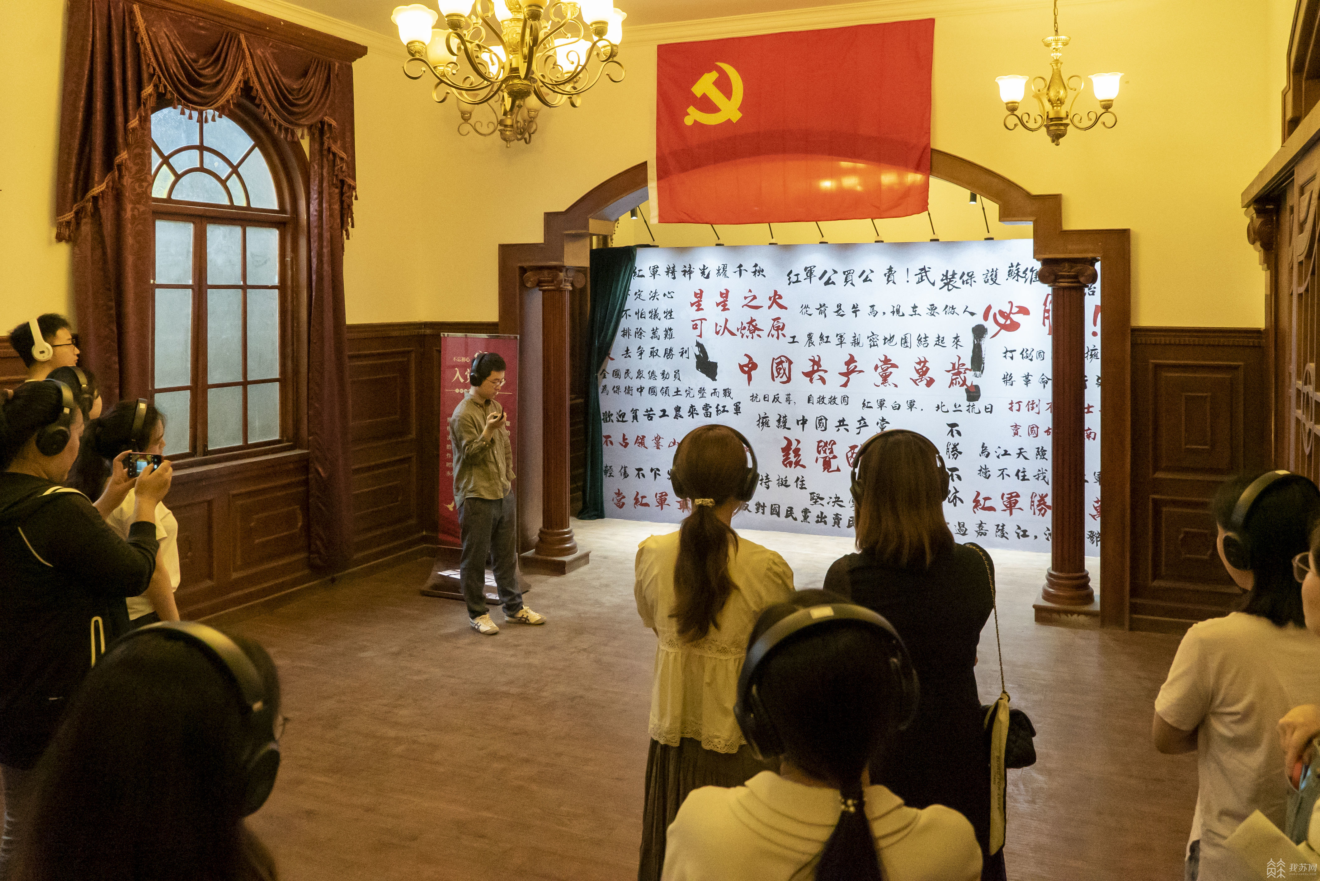 无锡影都“百年风华正茂”沉浸式红色教育路线通过人物角色、道具、置景、音效的气氛营造,运用剧本复原革命期间老上海的年代场景,再现烽火岁月和革命领袖陈云艰苦卓绝的事迹,雪浪街道团员青年跟着剧本情节边走边学,重温党史。