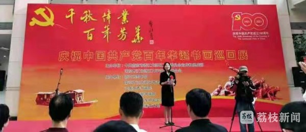 《千秋伟业·百年芳华》庆祝中国共产党百年华诞书画巡回展这一文化盛会,经过六个月的精心准备,5月12日在南湖之畔的嘉兴市图书馆开幕。中共南京市委江北新区工作委员会宣传和统战部副巡视员、区文联常务副主席李云为本次展览致开幕词。