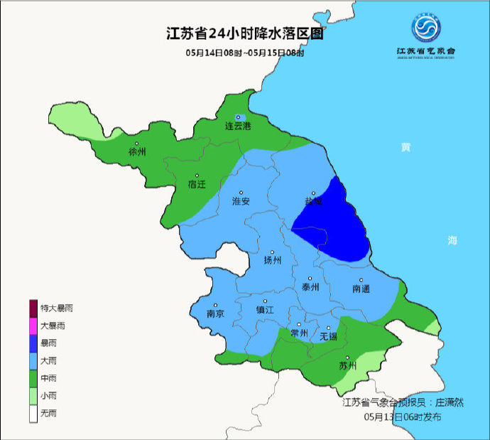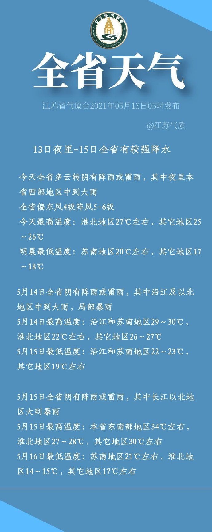 今天全省多云转阴有阵雨或雷雨,其中夜里本省西部地区中到大雨,全省偏东风4级阵风5-6级,今天最高温度:淮北地区27℃左右,其它地区25~26℃,明晨最低温度:苏南地区20℃左右,其它地区17~18℃。