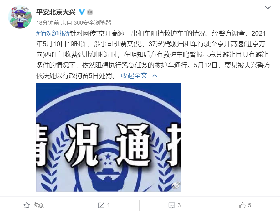 荔枝新闻讯 针对网传“京开高速一出租车阻挡救护车”的情况,经警方调查,2021年5月10日19时许,涉事司机贾某(男,37岁)驾驶出租车行驶至京开高速(进京方向)西红门收费站北侧附近时,在明知后方有救护车鸣警报示意其避让且具有避让条件的情况下,依然阻碍执行紧急任务的救护车通行。5月12日,贾某被大兴警方依法处以行政拘留5日处罚。