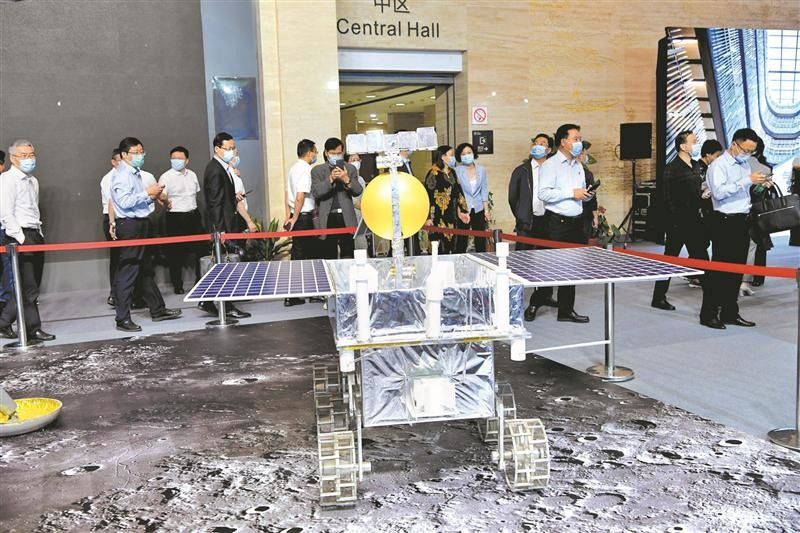 展览中,金灿灿的嫦娥五号着陆器、上升器模型引人注目。嫦娥五号任务是我国航天领域迄今为止复杂度最高、技术跨度最大的航天系统工程。去年12月17日,嫦娥五号携带月球样品返回地球,标志着我国探月工程“绕、落、回”三步走完美收官,也验证了我国登月返回的相关技术。
