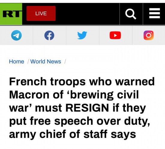 上周日(9日),多名法国现役军人致信总统马克龙,称在后者对伊斯兰主义做出“让步”之后,该国正在酝酿一场“内战”。